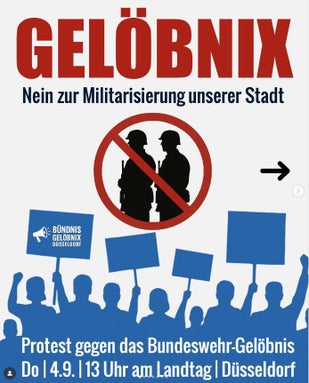 Die geplante Militärshow ist ein weiterer Schritt, Deutschland kriegstüchtig zu machen: Nicht mit uns. Wir geloben: Nie wieder Krieg! Auf die Straße gegen das Gelöbnis. Wir treffen uns am Landtag.