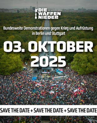 Die Initiative „Nie wieder Krieg – die Waffen nieder!“ ruft für den 3. Oktober zu einer bundesweiten Demonstration an zwei Orten in Berlin und Stuttgart auf. Mehr Infos unter:
